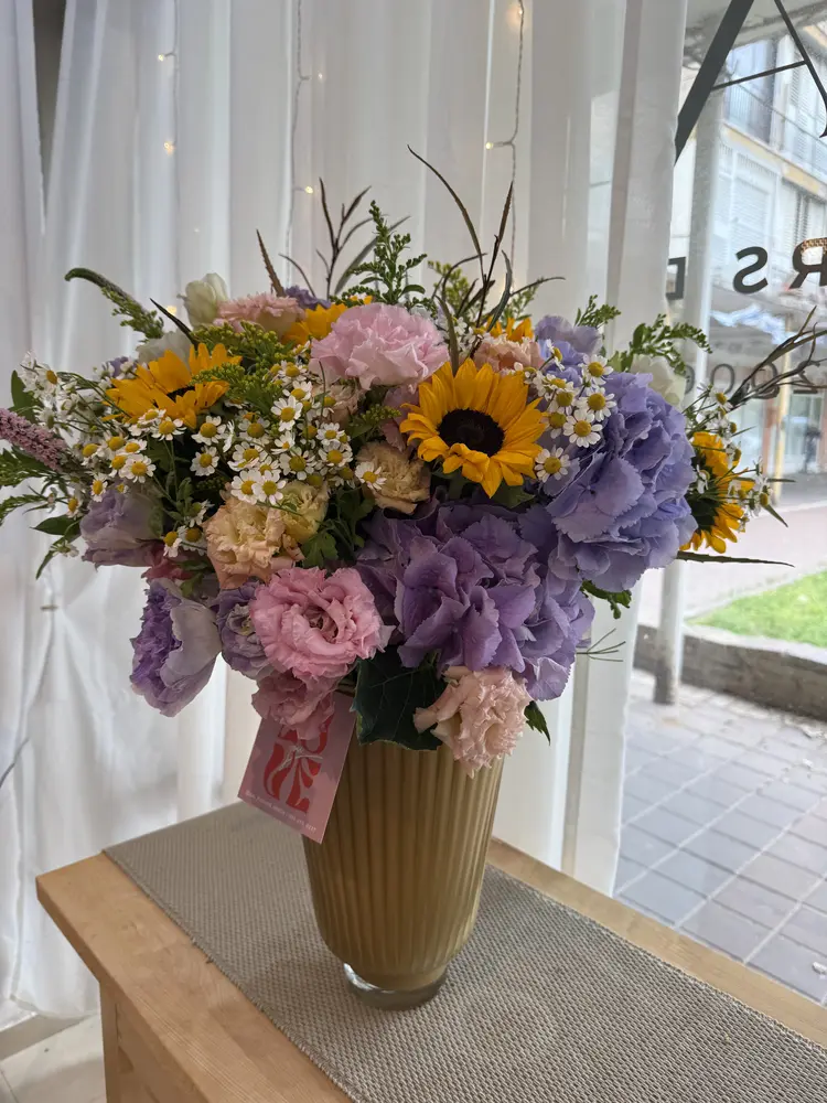 זר בגודל XL עם פרחי עונה חמניות, חרציות,ליאזיאנטוס הורטנזיות ועלי קישוט הורטניות,ועלי קישוט.