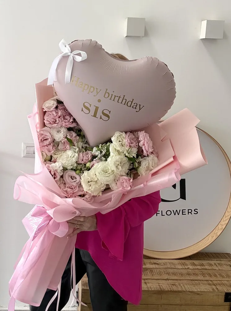 זר בגודל L שזור בליזאנטוס לבן וורוד, וענפי קישוט, בעיטוף מרשים ,בלון לב גדול בכיתוב אישי, וכרטיס ברכה מעוצב