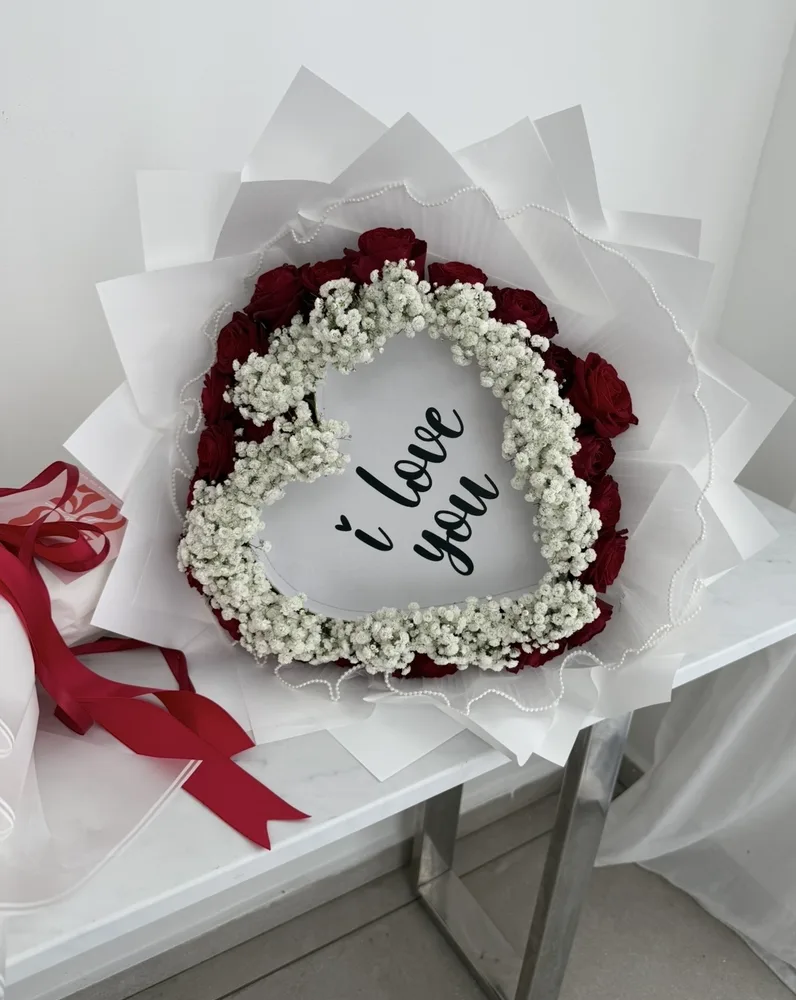 זר ורדים בצורת לב עם כיתוב ברכה אישית ודף עליון נשרף לגילוי הברכה. מעיטוף מהודר וכרטיס ברכה מעוצב