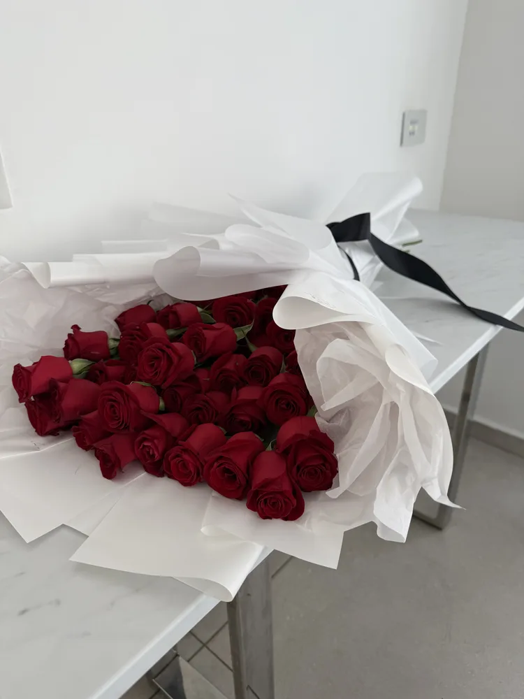 זר של 30 ורדים גבוהים מדורג בעיטוף מיוחד וכרטיס ברכה מעוצב