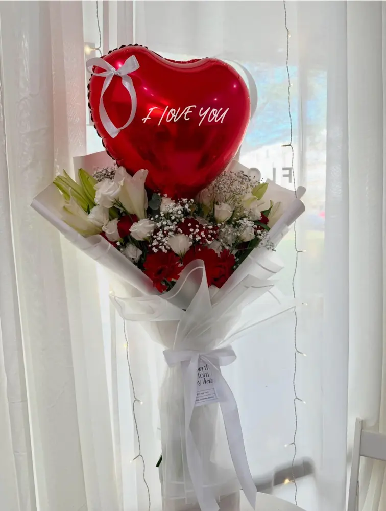 זר אהבה משולב שושן צחור, ליזאנטוס לבן,גיפסנית וגרברות אדומות, בתוספת בלון לב בכיתוב אישי ,וכררטיס ברכה מעוצב