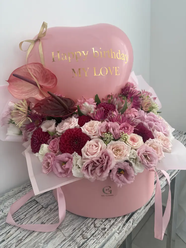 מארז פרחים XL בקופסא עגולה קשיחה עם פרחי עונה יוקרתיים בתוספת בלון איש וכרטיס ברכה