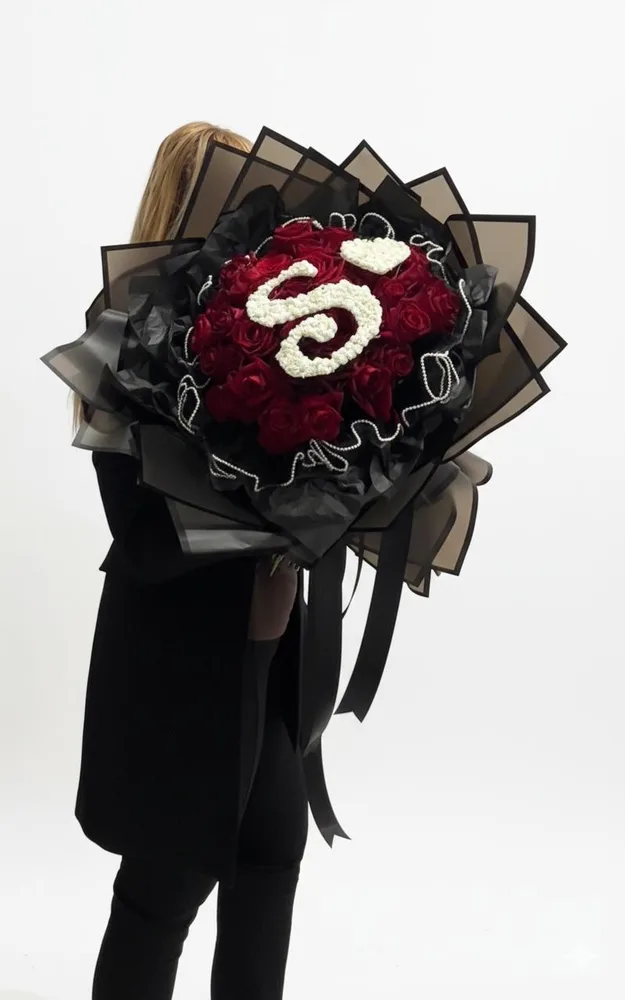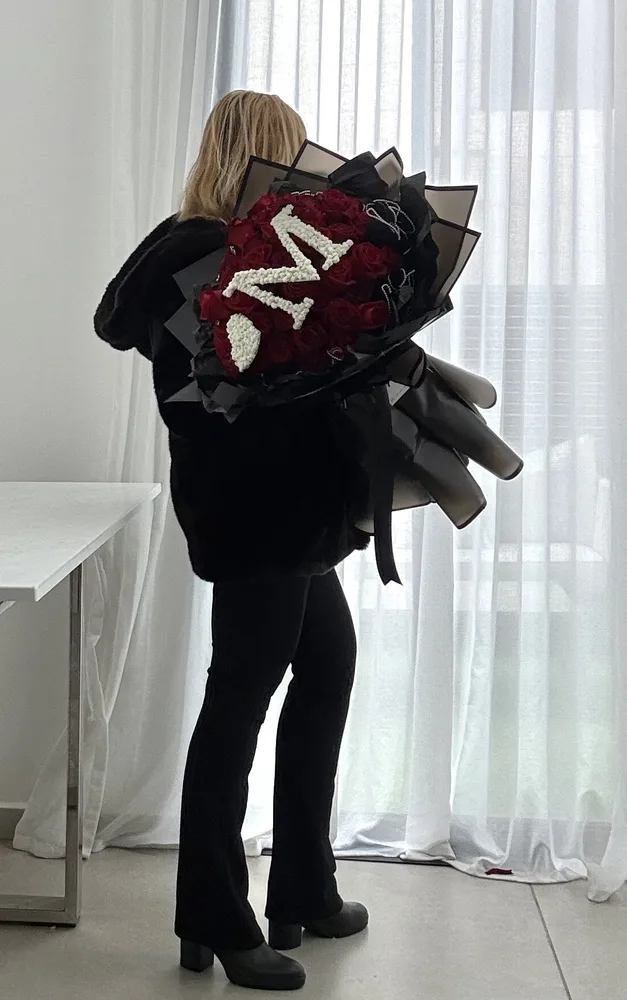 זר של כ60 ורדים אדומים בשילוב אות של גיפסנית לבנה, בעיטוף מהודר וכרטיס ברכה מעוצב.