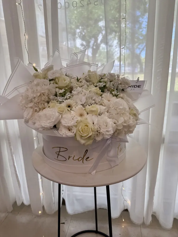 מארז פרחים לבן XXL בקופסא קשיחה ובצירוף כרטיס ברכה מעוצב