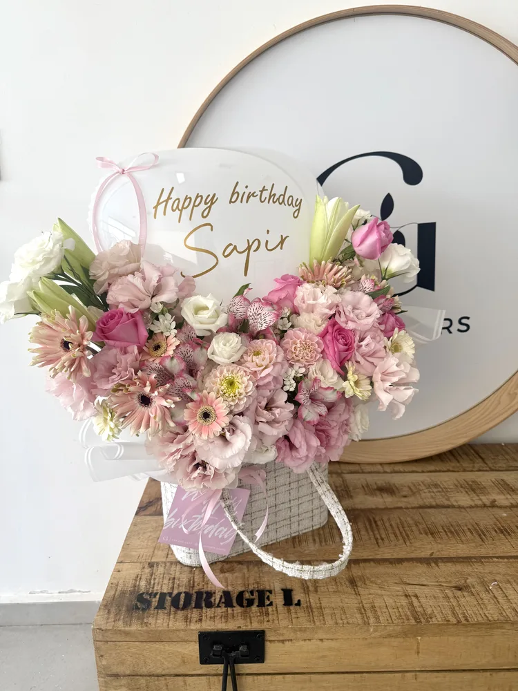 תיק בד ארוג בצבע לבן שזור בפרחים בצבעי פסטל בתוספת בלון לב בכיתוב אישי ,וכרטיס ברכה מעוצב.