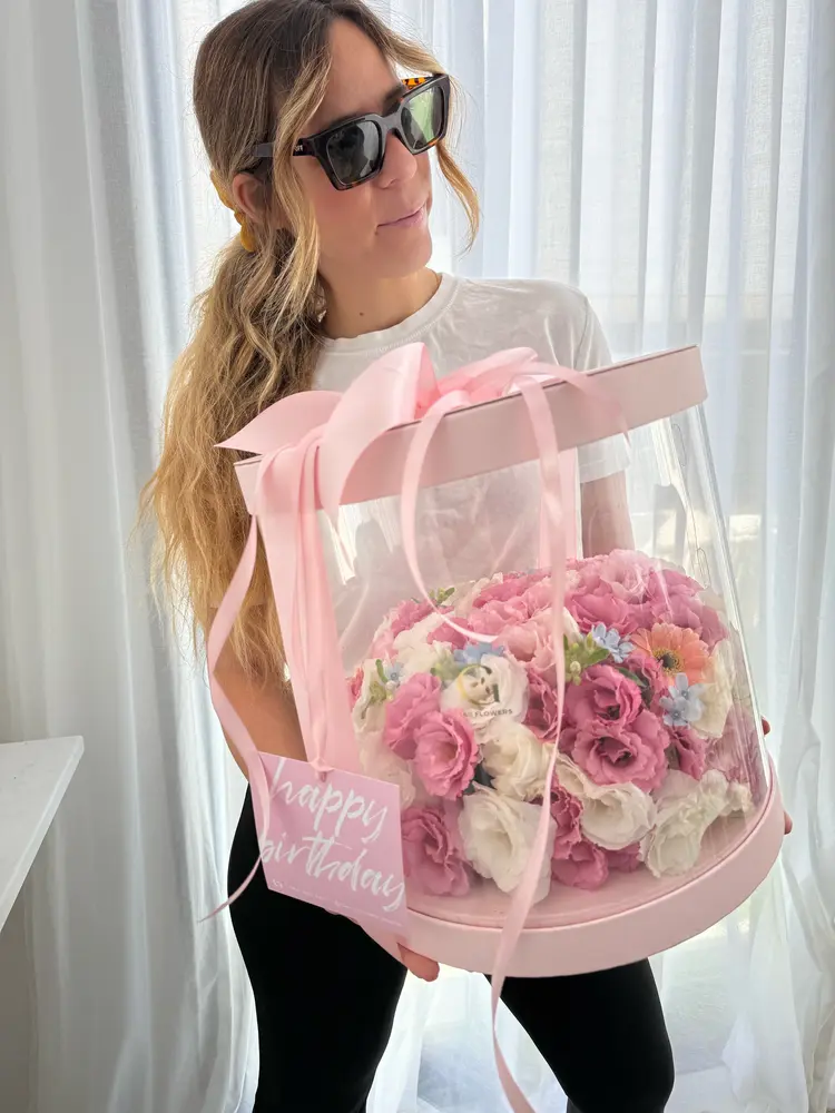 הטרנד הכי חם:עוגת פרחים בגודל XL מפרחים בגוונים ורודים, בתוספת נר ובתוך מארז מהודר, בתוספת כרטיס ברכה מעוצב