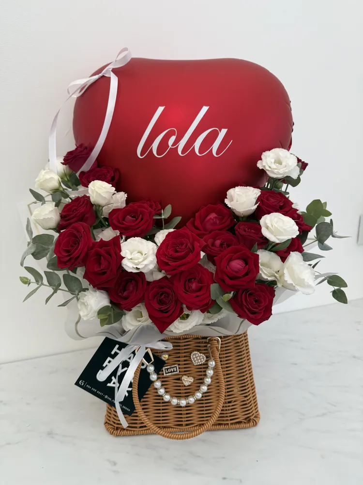 מארז ורדים עם ליזיאנטוס וענפי קישוט , בתוך סלסלת אקססוריז בתוספת בלון עם כיתוב אישי וכרטיס ברכה מעוצב מתנה