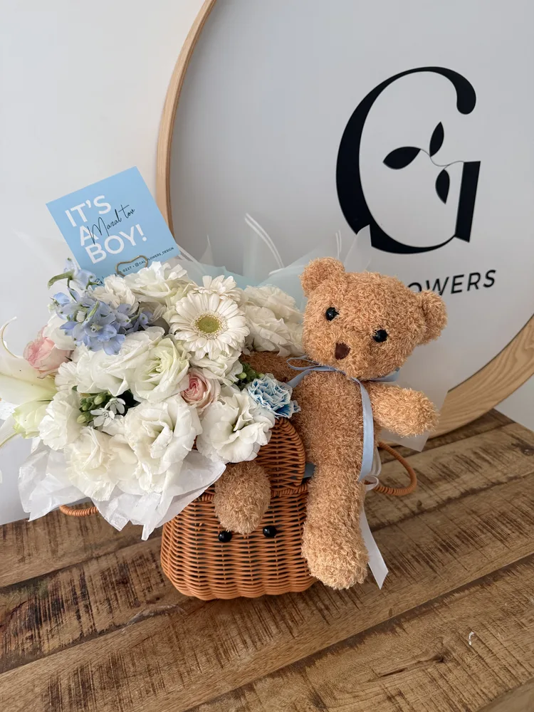 מארז פרחים בסל ארנב בתוספת בובת דובי ובלון לב עם כיתוב אישי, וכרטיס ברכה מעוצב.