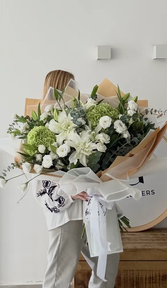 זר בגודל XLס משולב פרחי עונה לבנים וירוקים בעיטוף נייר ממוחזר טבעי וכרטיס ברכה