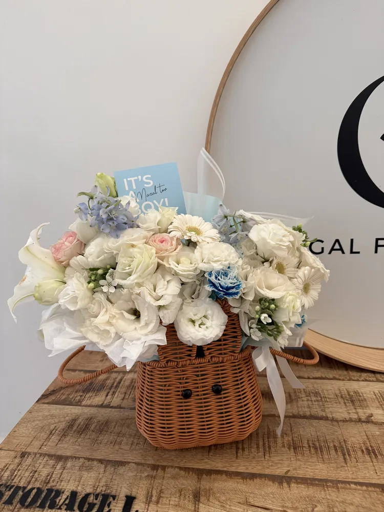מארז פרחים גדול בסלסלת ארנב ובתוספת כרטיס ברכה מעוצב