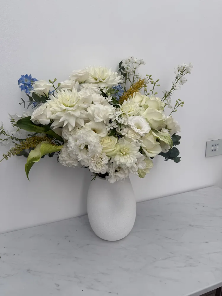 זר פרחים בגודל LARGE מפרחי עונה לבנים ותוספת פרחי שדה