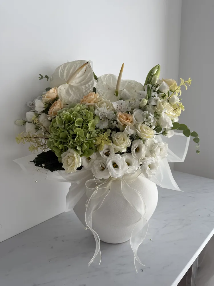 סידור פרחים עשיר מפרחי עונה בכד חרס לבן גדול