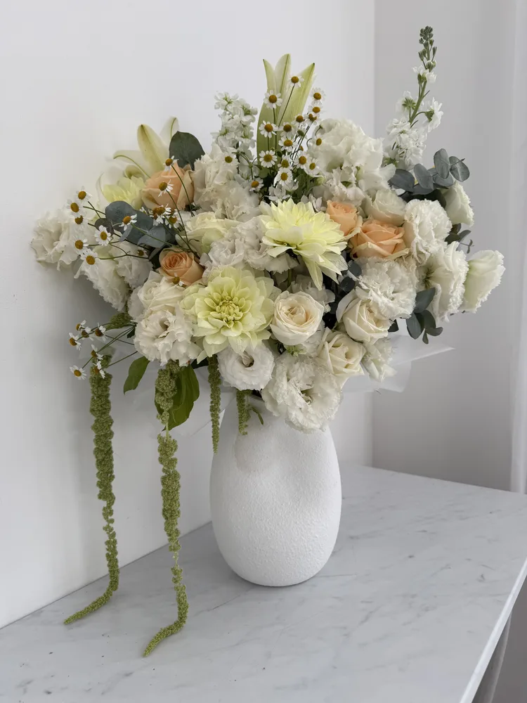 זר פרחים עשיר בגודל לארג בכלי מעוצב גבוה לבן.