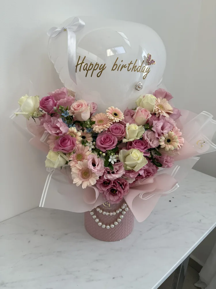 מארז פרחים בגודל M בקופסת עור ובתוספת שרשרת פנינים,עם פרחי עונה בגוונים ורודים , ובתוספת בלון לב עם כיתוב אישי וכרטיס ברכה מעוצב