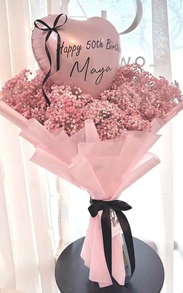 זר גיפסניות ורוד בגודל XXL בעיטוף יחודי ובתוספת בלון לב בכיתוב אישי וכרטיס ברכה מעוצב.