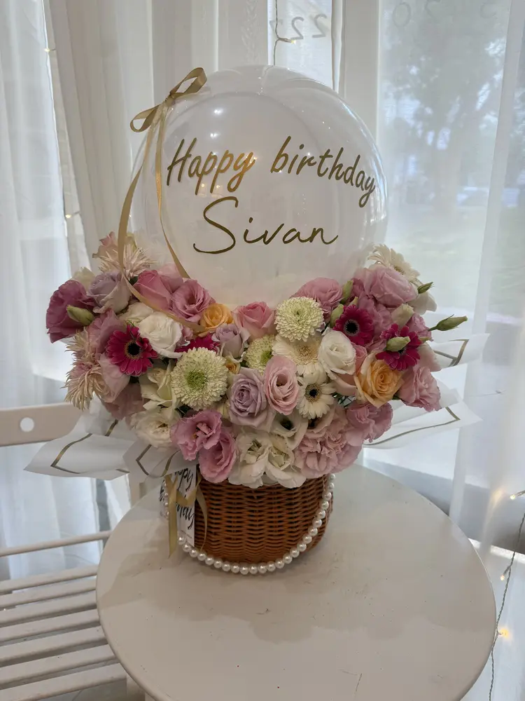 סל בגוון עץ טבעי ושרשרת פנינים בגודל XXL,שזורה עם זר פרחים בשלל גוונים של אהבה , כולל בלון בובו, בכיתוב אישי וכרטיס ברכה מעוצב
