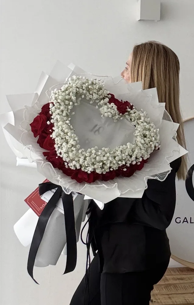 זר ורדים בצורת לב עם כיתוב ברכה אישית ודף עליון נשרף לגילוי הברכה. מעיטוף מהודר וכרטיס ברכה מעוצב