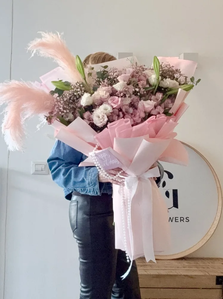 זר בגודל XL משולב בענפי פאמפס ופנינים ,שזור מפרחי ליזיאנטוס אלסטרומריה וענפי קישוט, בעיטוף יוקרתי וכרטיס ברכה.