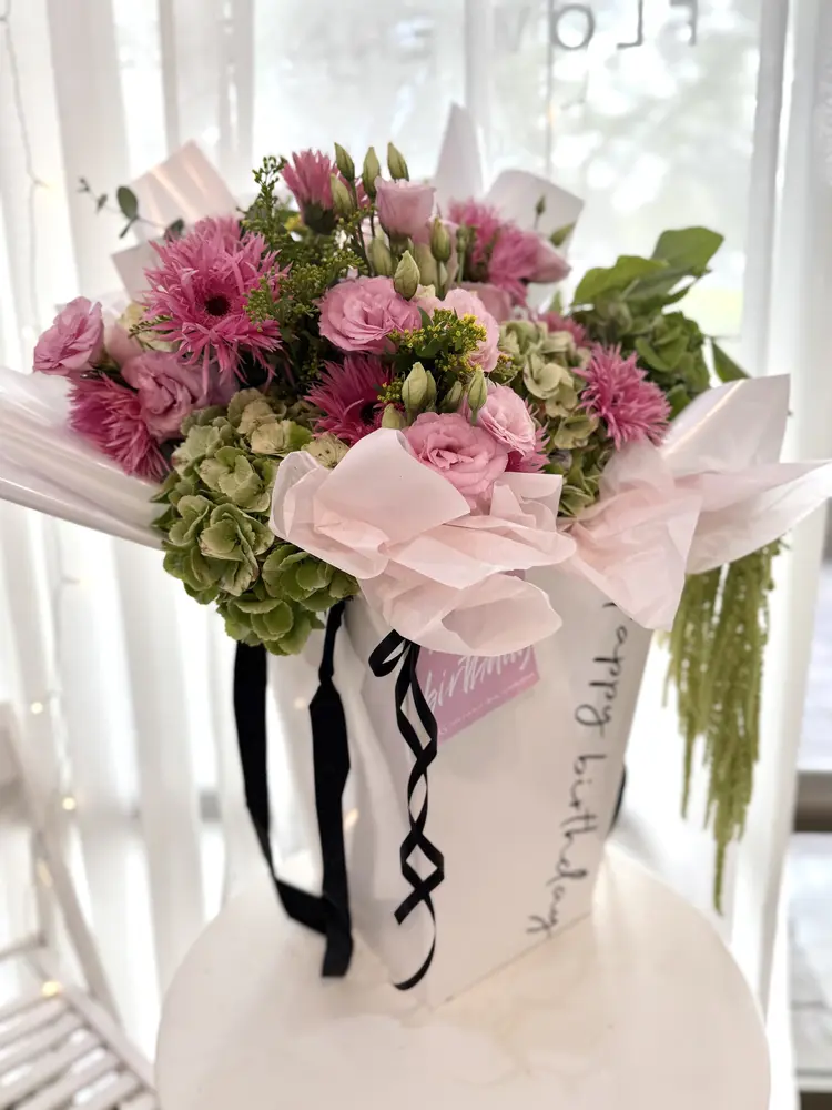 זר פרחים יוקרתי בגודל XXL משולב בפרחי הורטנזיה גרברה ספיידר/ליזיאנטוס /ורדים וירק ,בשקית קרטון גדולה