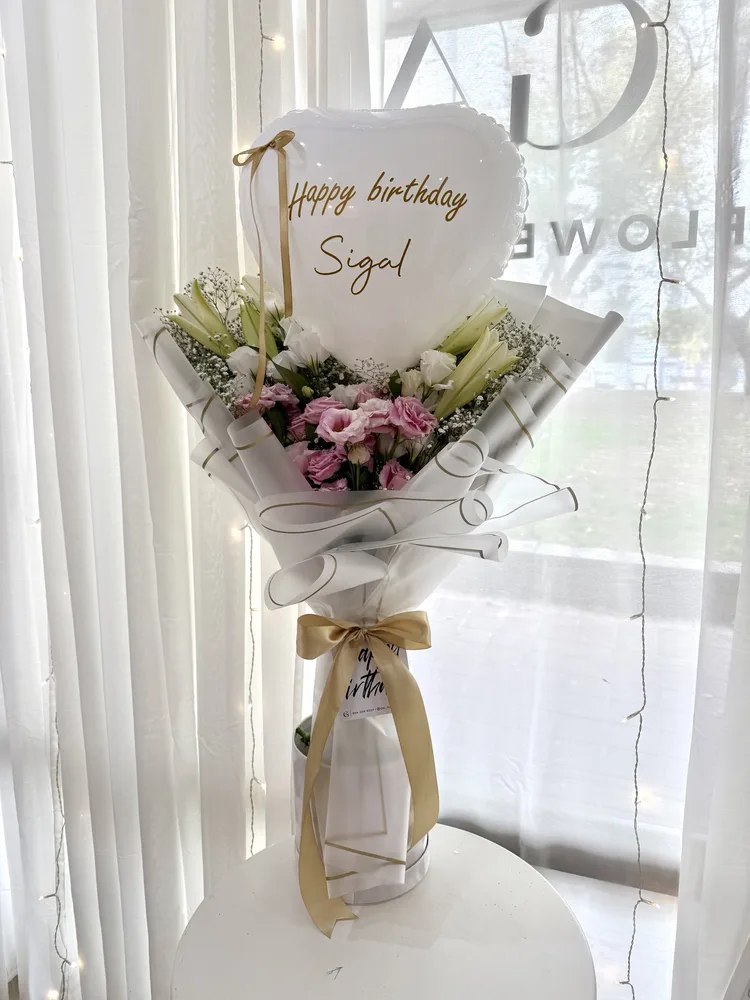 ,זר פרחים בגודל לארג משולב בפרחי ליזאנטוס, שושן צחור,ורדים ותוספת ירק עונתי בעיטוף חגיגי עם בלון לב בכיתוב אישי ,וכרטיס ברכה מעוצב