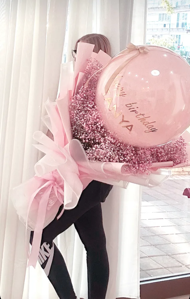 זר גיפסניות ורוד בגודל XXL עם בלון בועה בכיתוב אישי , בעיטוף חגיגי וכרטיס ברכה מעוצב