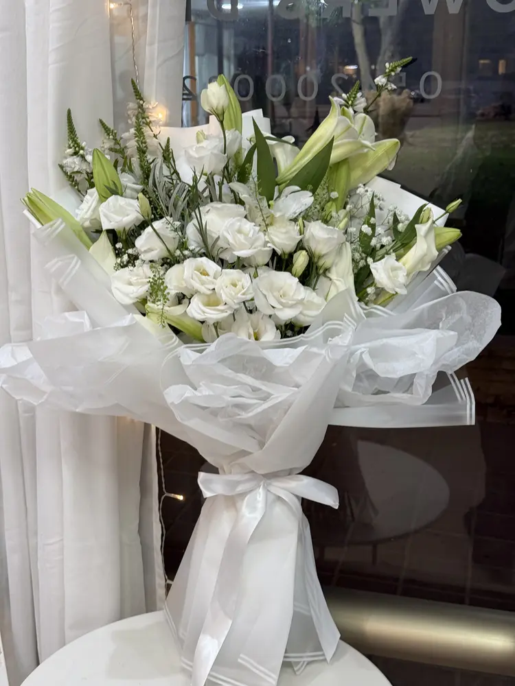 זר לבן בגודל L , שזור מפרחי ליזיאנטוס, שושן צחור גיפסנית וירק,