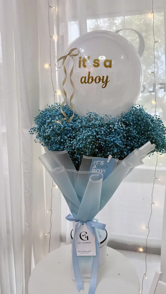 זר גיפסניות כחול בגודל XXL בעיטוף מיוחד,בשילוב בלון בובו עם כיתוב אישי וכרטיס ברכה מעוצב.