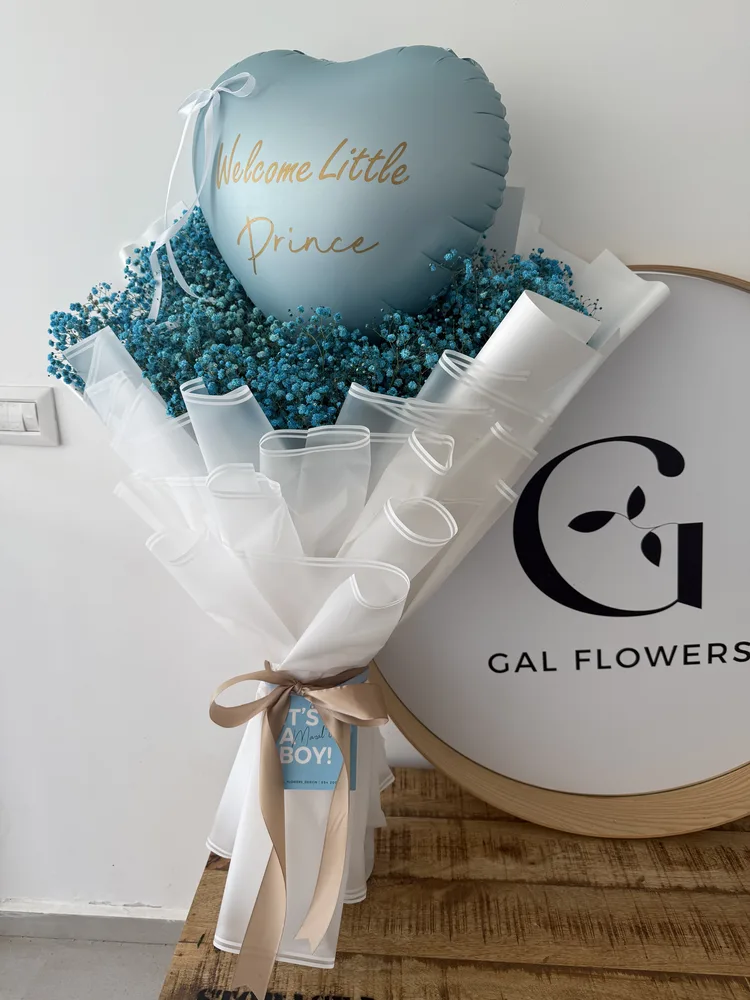 זר גיפסניות כחול בגודל XXL בעיטוף חגיגי ,בשילוב בלון לב עם כיתוב אישי וכרטיס ברכה מעוצב.