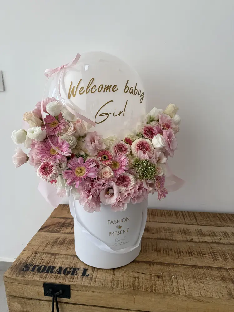 סידור פרחים בקופסא בגודל XL עם בלון cucu בכיתוב אישי וכרטיס ברכה מעוצב