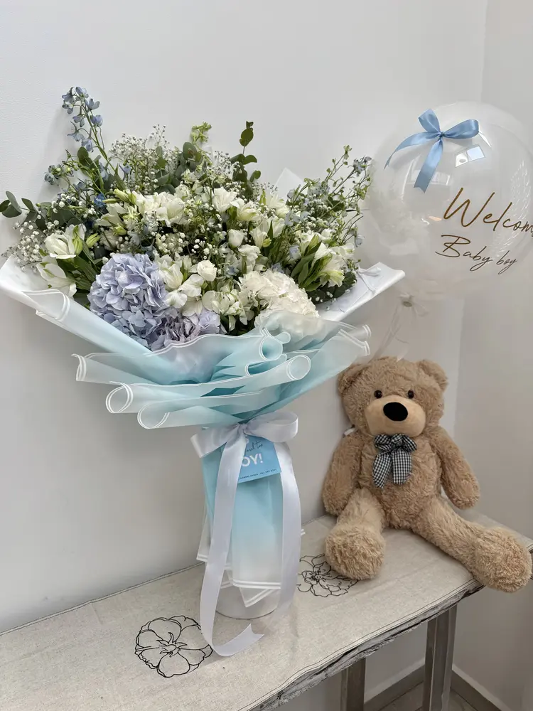 זר פרחים גדול XL בתוספת דובי ובלון בובו בכיתוב אישי וכרטיס ברכה מעוצב.