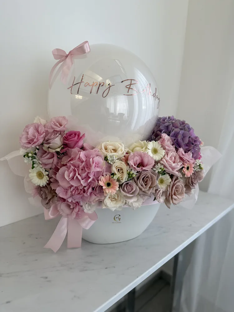 מארז פרחים מון שריי בגודל XL בכלי קרמיקה לבן בתוספת בלון בובו בכיתוב אישי , וכרטיס ברכה מעוצב