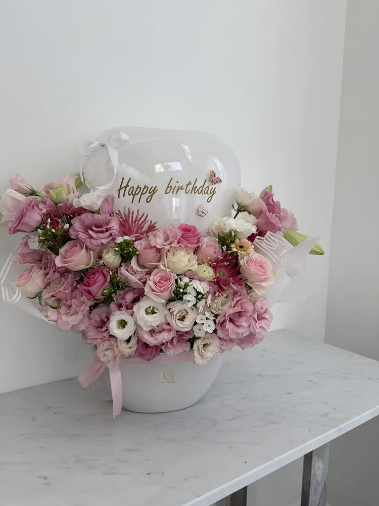 מארז פרחים מון שריי בגודל l שזור בפרחים בגוונים ורוד לבן,בתוספת בלון בובו בכיתוב אישי , וכרטיס ברכה מעוצב