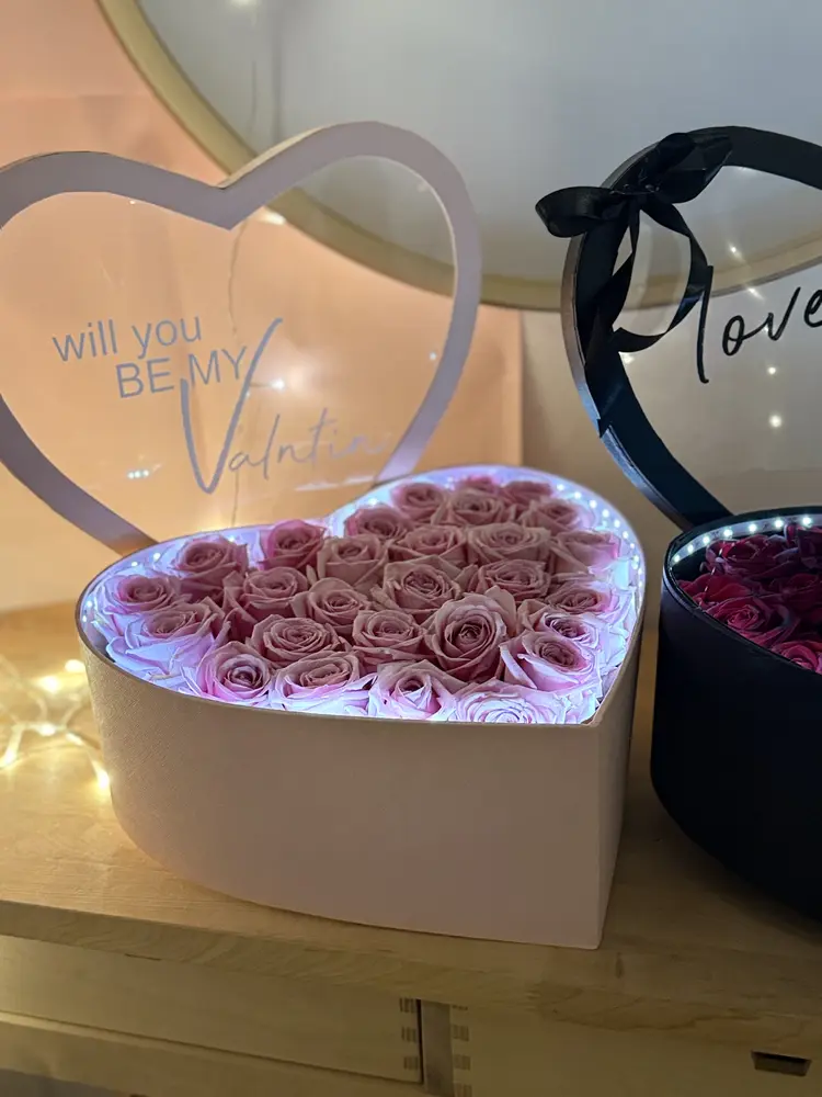 מארז ורדים יוקרתי בגודלXL בקופסת לב מוארת לדים ובה כ60 ורדים בגוון ורוד בייבי