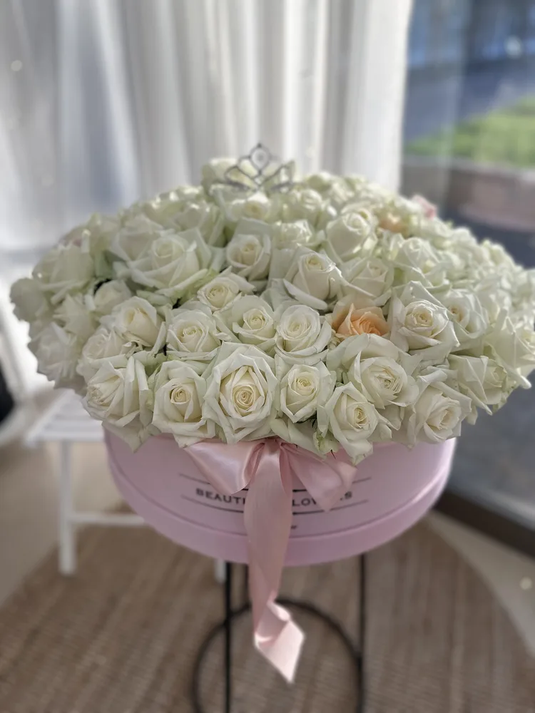 קופסת ורדים לבנים XXL ןובה כ100 ורדים לבנים בתוספת כתר ראש