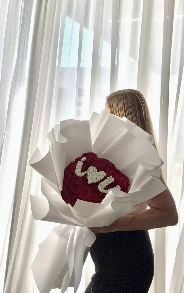 זר של כ-60 ורדים אדומים בשילוב 3 אותיות של גיפסנית לבנה, בעיטוף מהודר וכרטיס ברכה מעוצב.