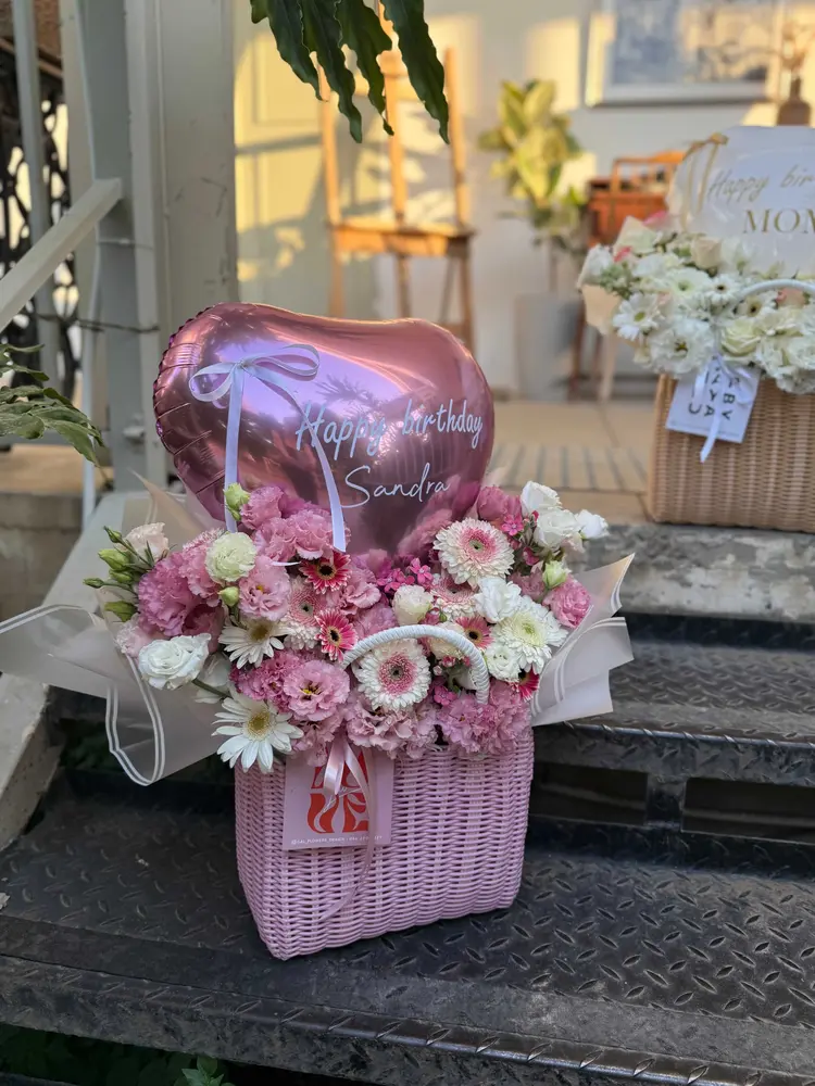 סל גדול ראטן בצבע ורוד או עם פרחים בגוונים ורודים, בתוספת בלון לב בכיתוב אישי ,וכרטיס ברכה מעוצב