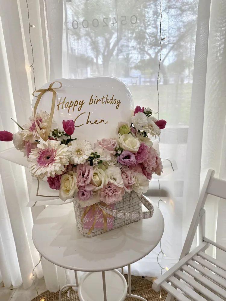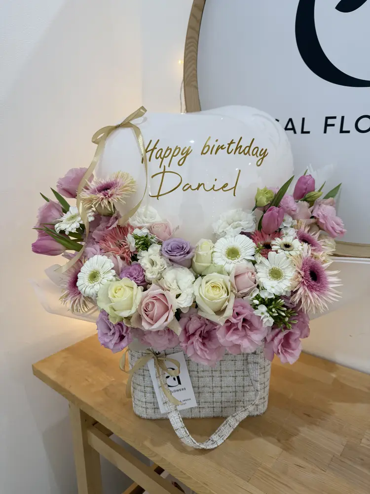 תיק בד ארוג בצבע לבן שזור בפרחים בצבעי פסטל בתוספת בלון לב בכיתוב אישי ,וכרטיס ברכה מעוצב.