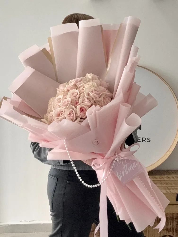 זר ורדים עגול בצבע ורוד בייבי בעיטוף עשיר ובצירוף כרטיס ברכה מעוצב