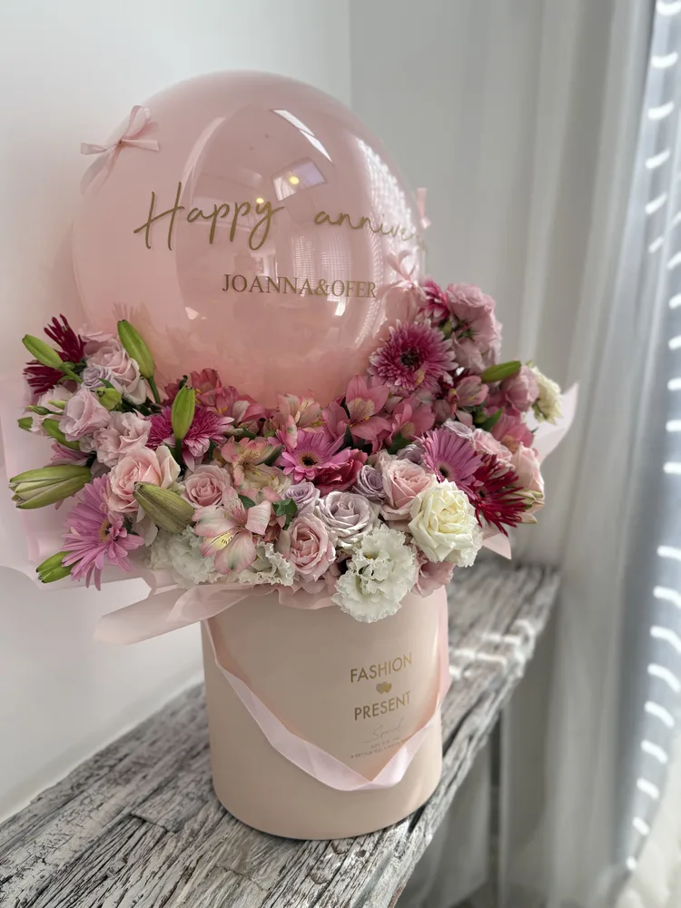 מארז פרחים עשיר בגודל XL עם בלון בועה בכיתוב אישי וכרטיס ברכה מעוצב