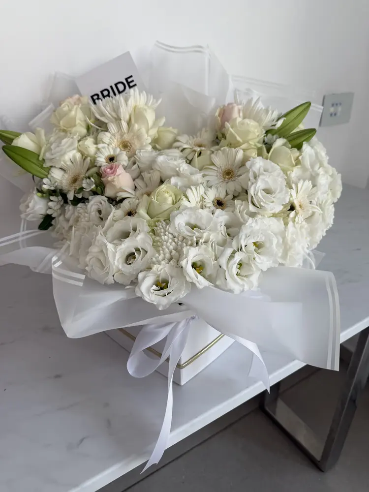 קופסת לב LARGE עם פרחים לבנים ובצירוף כרטיס ברכה.