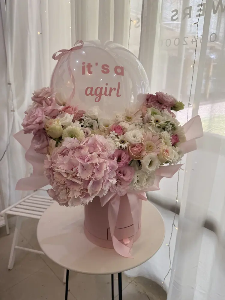 סידור פרחים יוקרתי ליולדת בקופסה בגודל XL, ובתוספת בלון בובו בכיתוב אישי, וכרטיס ברכה מעוצב.